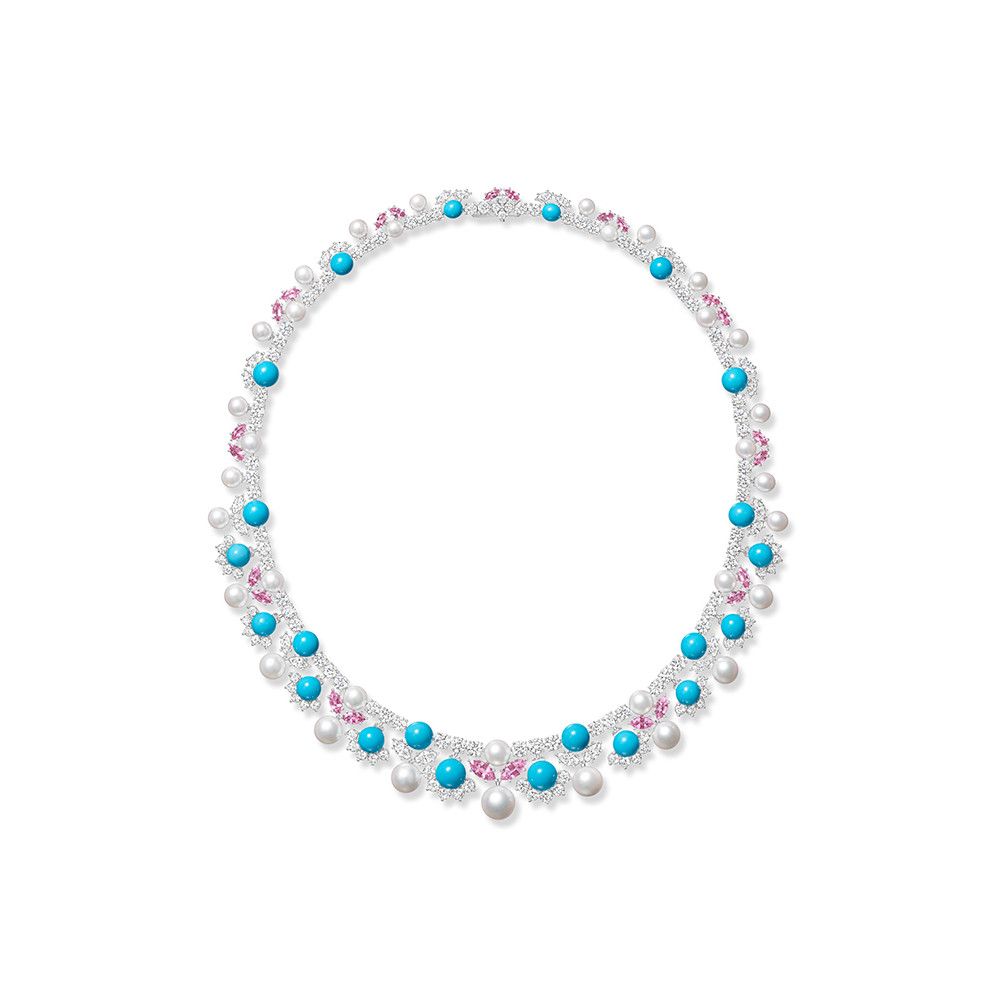 Для этого колье, вдохновленного Райской гаванью на Окинаве, Япония, нью-йоркский ювелирный дом выбрал розовые и жемчужные оттенки восхода солнца над Тихим океаном. Колье украшено бриллиантами, бирюзовыми бусинами и белыми жемчужинами, а также акцентами из розовых сапфиров.