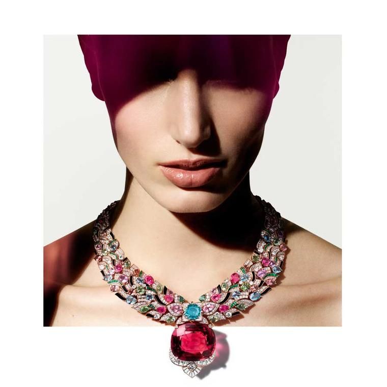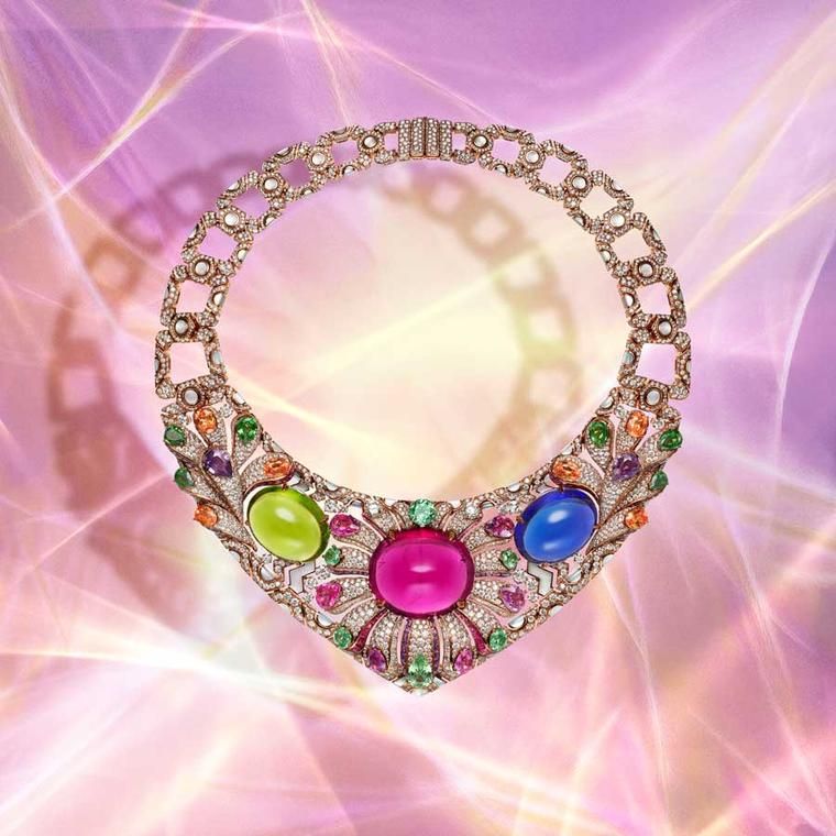 Колье Polychromatic Bloom украшено крупными кабошонами из рубеллита (весом 106,36 карата), хризолита (весом 55,52 карата) и танзанита (весом 55,11 карата), вставленными в колье из вьющихся цветочных элементов. Ювелирные украшения Bvlgari Polychroma High Jewellery 2025 (P.Langer):