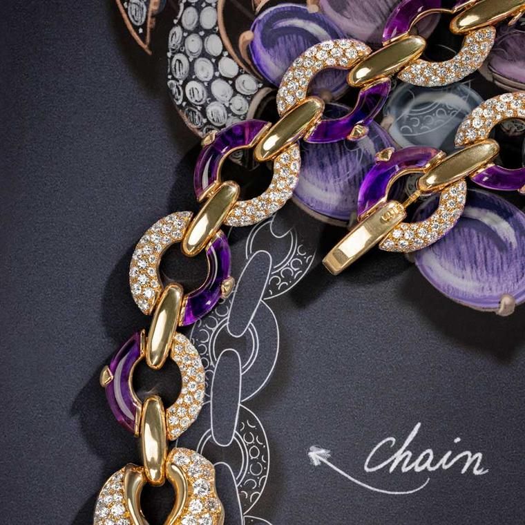 Это колье с аметистами, вставленными вплотную друг к другу в звенья цепочки и чередующимися с бриллиантами pavé, демонстрирует внимание к деталям и мастерство ювелиров Bvlgari. Ювелирные украшения Bvlgari Polychroma High Jewellery 2025: