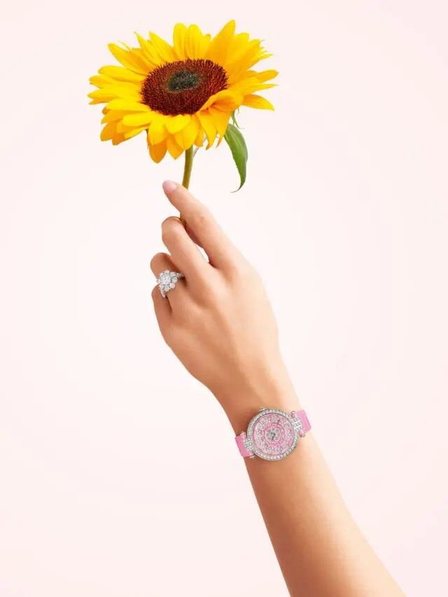 На каждом циферблате размещены 12 мерцающих бриллиантовых подсолнухов, обозначающих каждый час, а также миниатюрные цветы в центре, образованные бриллиантовыми лепестками и розовыми сапфирами или изумрудами круглой огранки. В комплекте с шикарными соответствующими ремешками из кожи аллигатора с пряжкой из белого золота с 17 бриллиантами эти часы — настоящий хит.