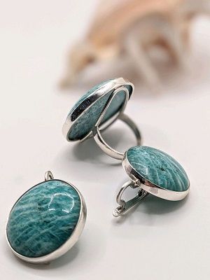 При изготовлении колец преимущественно мастера обрамляют амазонит серебром, мельхиором или ювелирным сплавом. Золото и платина используются довольно редко