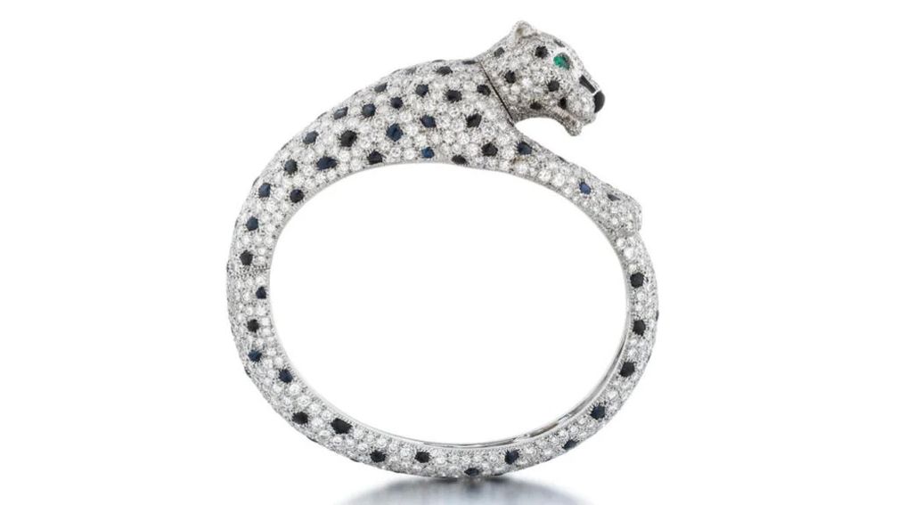 Этот браслет от Cartier украшен пантерой с пятнами из сапфиров среди бриллиантов классической огранки, изумрудными глазами грушевидной формы и носом из полированного оникса. Верхняя оценка украшения составляет 300 000 евро (352 373 доллара США):
