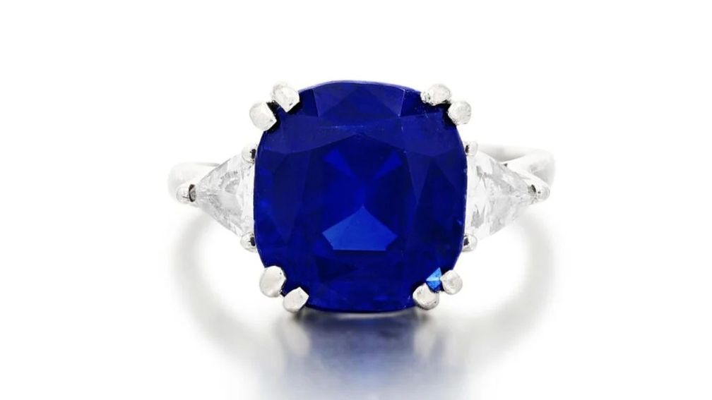 Аукционный дом выставит это кольцо с кашмирским сапфиром огранки кушон весом 10,68 карата между двумя треугольными бриллиантами. Его максимальная цена составляет 280 000 евро (328 881 доллар США):