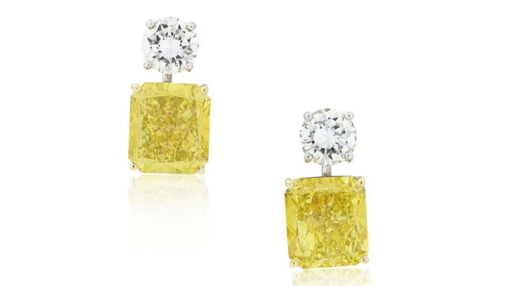 Ожидается, что эти серьги от Graff будут проданы за 280 000 евро (328 881 доллар США). Они украшены бриллиантами огранки радиант насыщенно-желтого цвета чистоты VS1 весом 6,35 и 7,04 карата, подвешенными к бриллиантам классической огранки:
