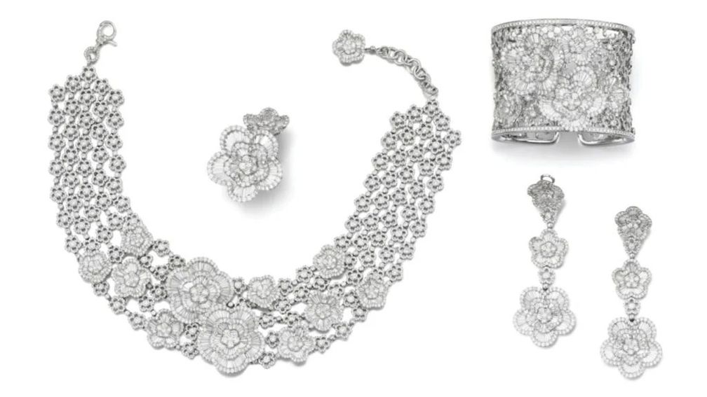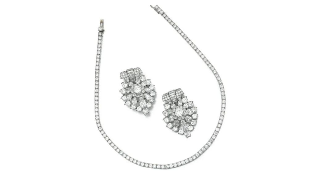 Этот лот от Schreiner включает в себя колье с цветочным дизайном и бриллиантами конической багетной и классической огранки, а также серьги, кольцо и браслет с аналогичными мотивами. Его стоимость может составить 150 000 евро (176 186 долларов США):