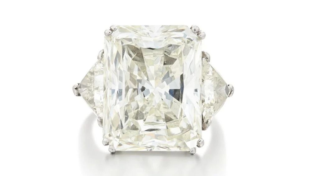 Кольцо с прямоугольным бриллиантом с усеченными краями весом 16,98 карата оценивается в 150 000 евро (176 186 долларов США):