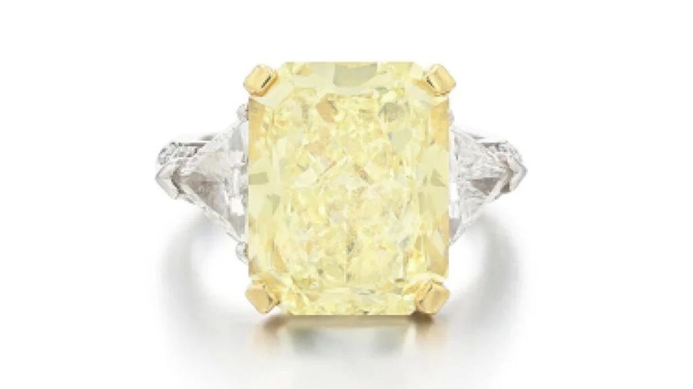 Это бриллиантовое кольцо от Graff может быть продано за 140 000 евро (164 441 доллар США). Оно украшено светло-желтым камнем огранки радиант весом 10,03 карата чистоты VS2, расположенным между двумя бриллиантами треугольной огранки: