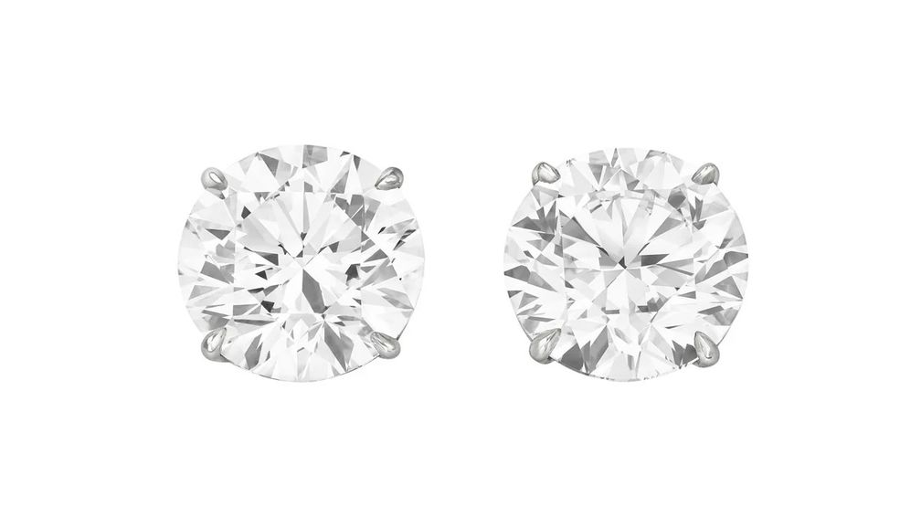 Эти серьги-гвоздики украшены двумя круглыми бриллиантами бриллиантовой огранки. Один из них – бриллиант типа IIa, чистоты VVS2, цвета D, весом 5,13 карата, а другой – бриллиант типа IIa, чистоты VVS2, цвета D, весом 5,04 карата.