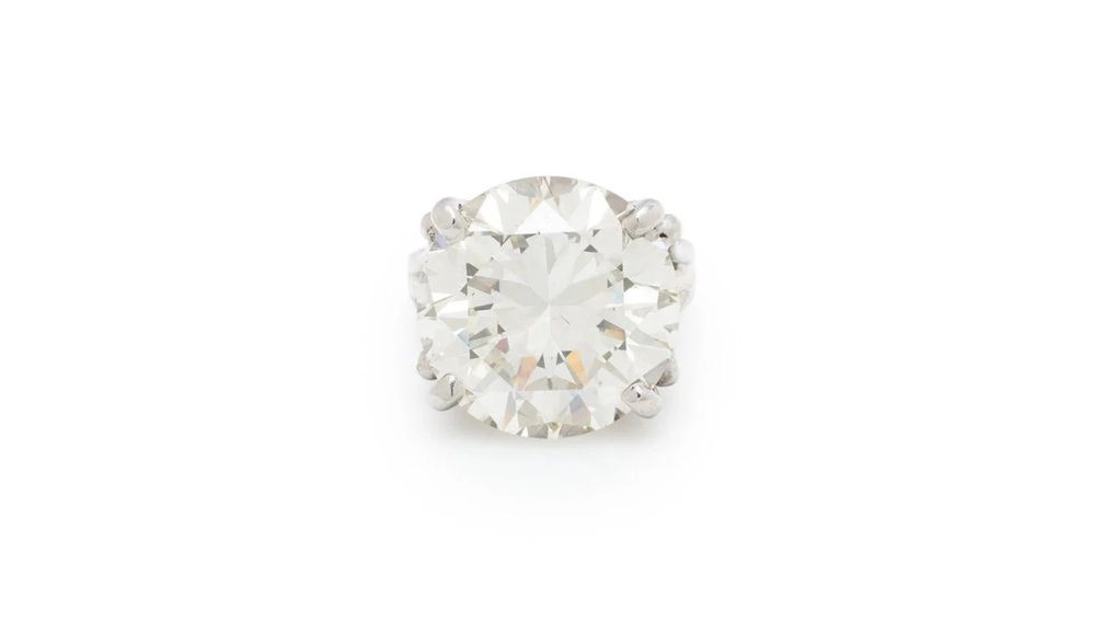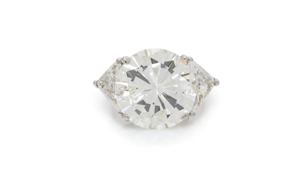 Аукционный дом предлагает этот круглый бриллиант весом 12,32 карата, цвета L, чистоты VS2, украшенный двумя бриллиантами огранки триллион. Предварительная максимальная оценка кольца составляет $ 150 000.