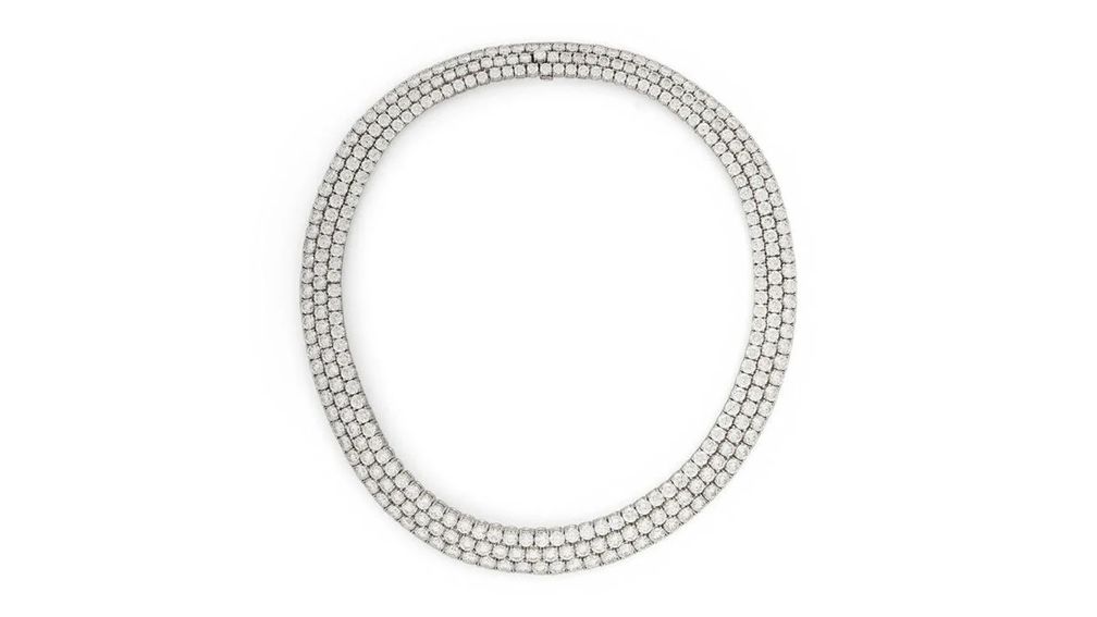 Это колье имеет предварительную максимальную оценку $ 80 000. Украшение состоит из трех рядов бриллиантов круглой огранки, общим весом 60,17 карата.