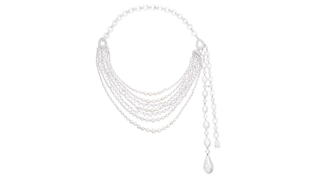 Колье от Дома Glenn Spiro с нитями градуированных природных жемчужин, грушевидным бриллиантом весом 3,02 карата, бриллиантами разных огранок, а также жадеитовыми вставками.