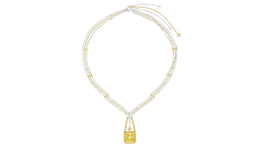 Это колье из частной коллекции украшено квадратным бриллиантом модифицированной огранки, весом 20,04 карата, ярко-желтого цвета, чистоты VS1.