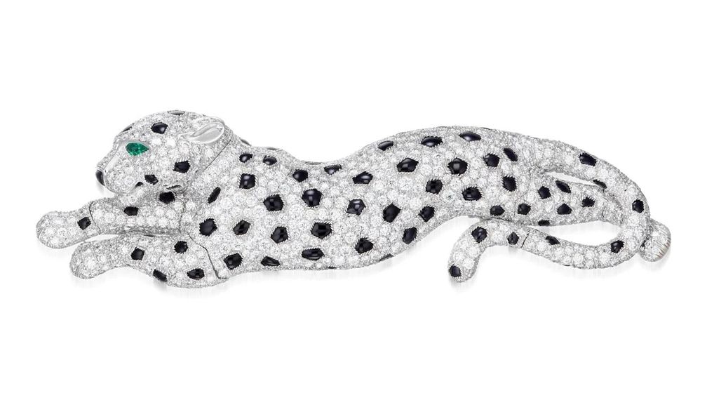 Брошь от Cartier, выполненная в виде лежащей пантеры с шарнирными лапами, украшена бриллиантами бриллиантовой огранки и ониксом (пятна и нос), а также изумрудами (глаза).