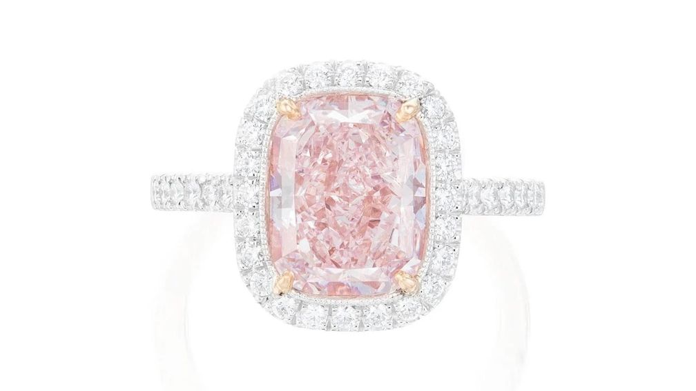 Кольцо с прямоугольным бриллиантом модифицированной огранки, весом 4,05 карата, светло-розового цвета, безупречной чистоты в окружении бриллиантов бриллиантовой огранки.