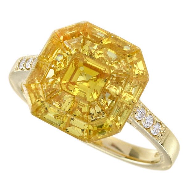 Сапфир сочного желтого цвета в соблазнительной форме ар-деко прекрасно сочетается с оправой из желтого золота и бриллиантами: эстетика старого и нового, которая сегодня широко востребована.