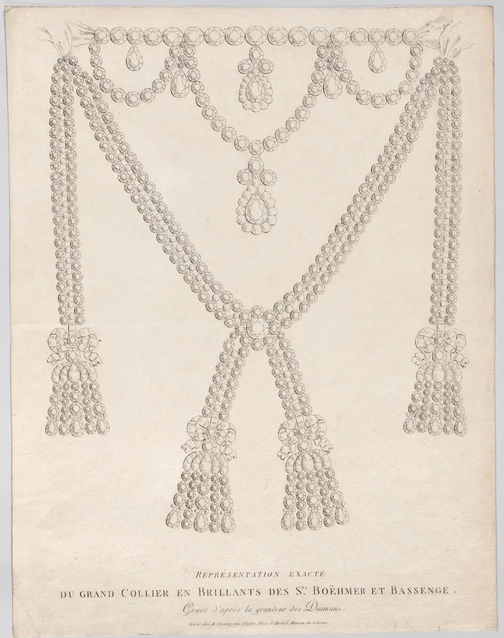 Эскиз ожерелья, первоначально изготовленного по заказу короля Людовика XV, позже оказавшегося замешанным в печально известном королевском скандале, связанном с Марией-Антуанеттой. Хоть оригинальное ожерелье так и не было найдено, считается, что в изделии, недавно представленном Sotheby’s, содержатся бриллианты из этой исторической драгоценности:
