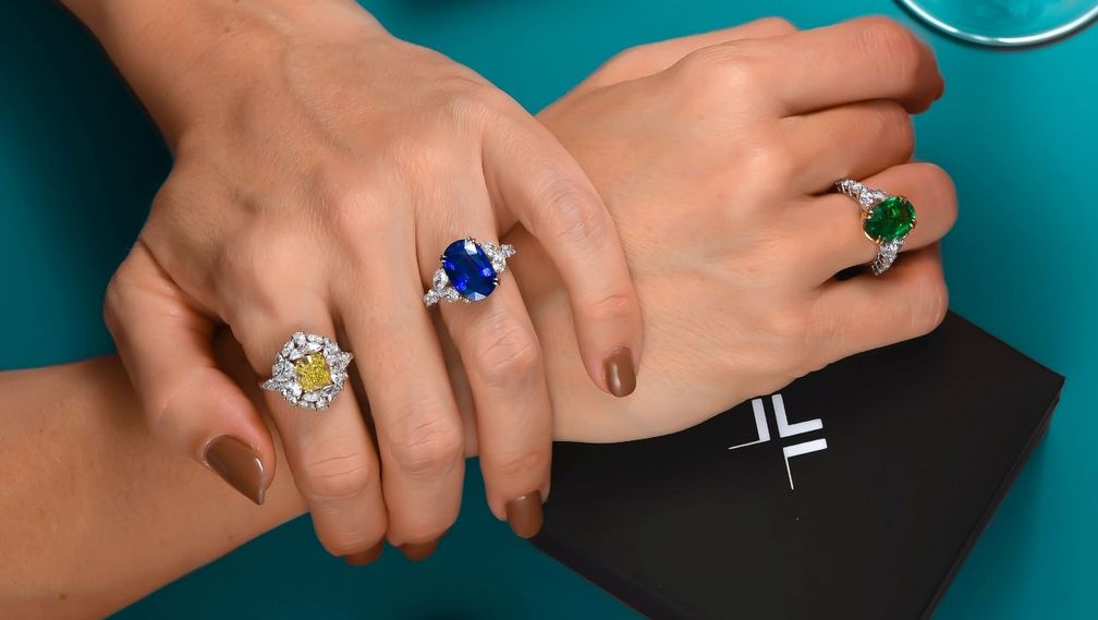Три кольца на заказ: кольцо с овальным королевским синим сапфиром весом 8,51 карата, кольцо с овальным изумрудом весом 5,49 карата и кольцо с бриллиантом фантазийного зелено-желтого цвета огранки кушон, весом 3,74 карата в окружении белых бриллиантов от Leibish (Leibish):