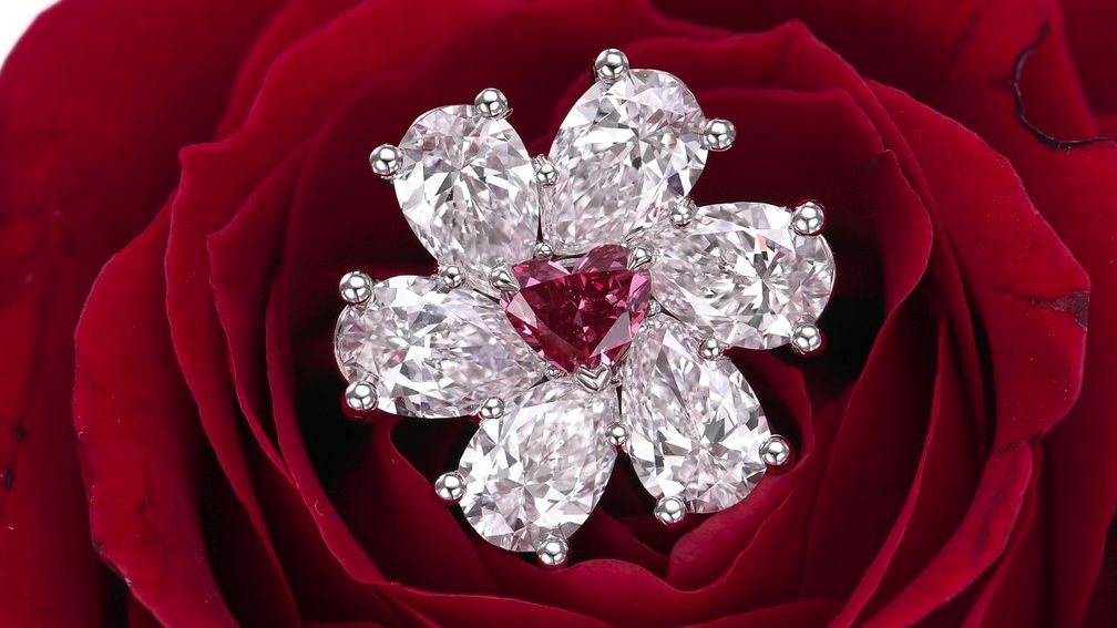 Кольцо Flower с фантазийным пурпурно-красным бриллиантом из Аргайла в форме сердца, весом 0,29 карата в окружении белых бриллиантов грушевидной огранки, цвета D от Leibish (Leibish):