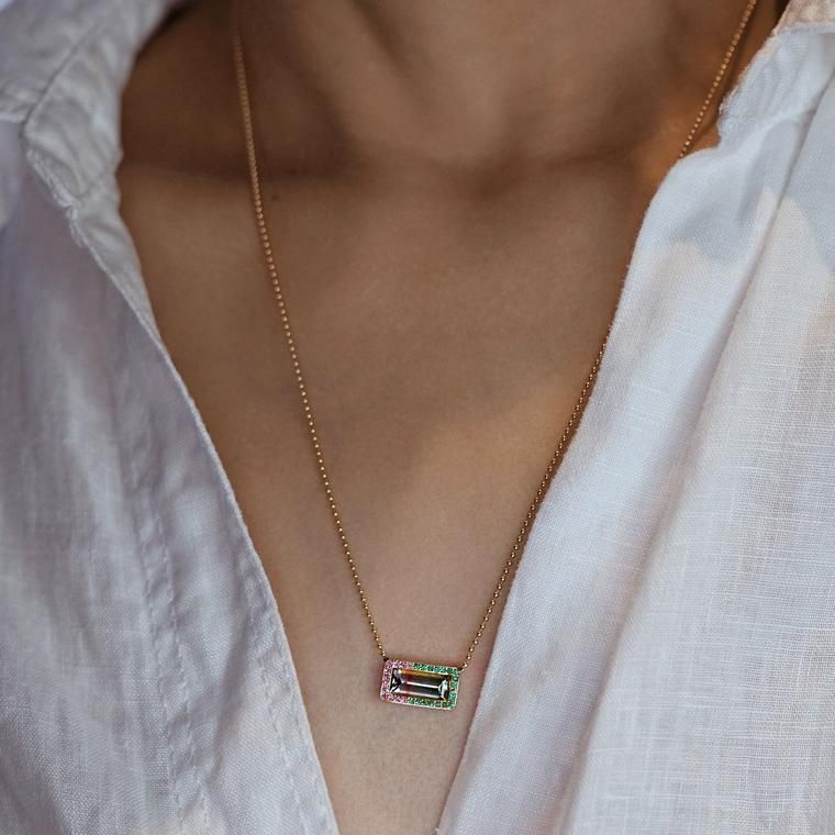 Редкий камень, сочетающий в себе розовые, зеленые и золотые тона, арбузный турмалин издавна символизировал креативность и уравновешенность. Центральный турмалин, обрамленный 12 розовыми сапфирами и 18 яркими изумрудами, воплощает яркое летнее настроение в одном драгоценном камне.