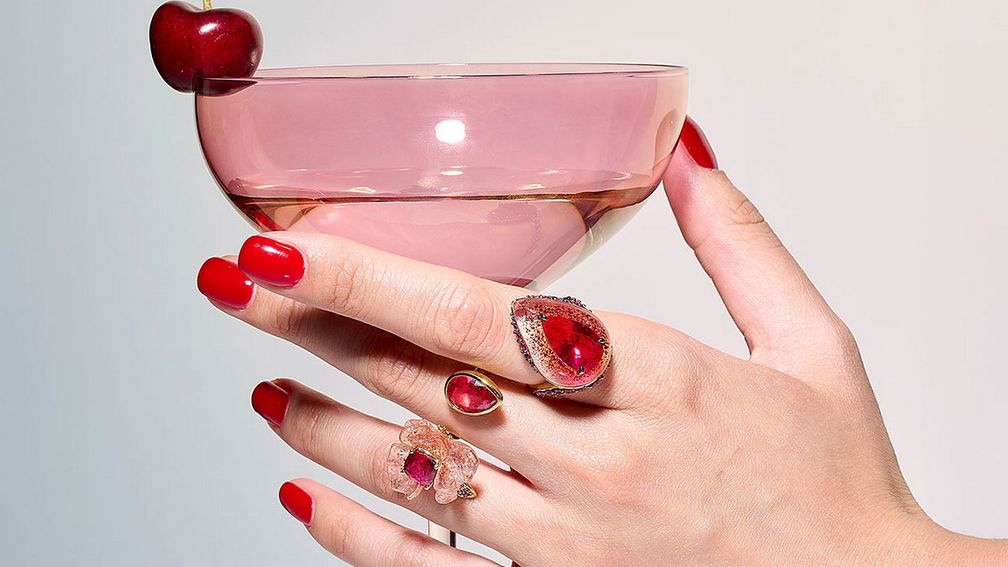 В результате коллекция продолжает ее фирменный яркий стиль, сочетая Fruit Gems с выращенными в лаборатории камнями, такими как рубины, изумруды и турмалины, создавая эффектные коктейльные кольца и серьги.