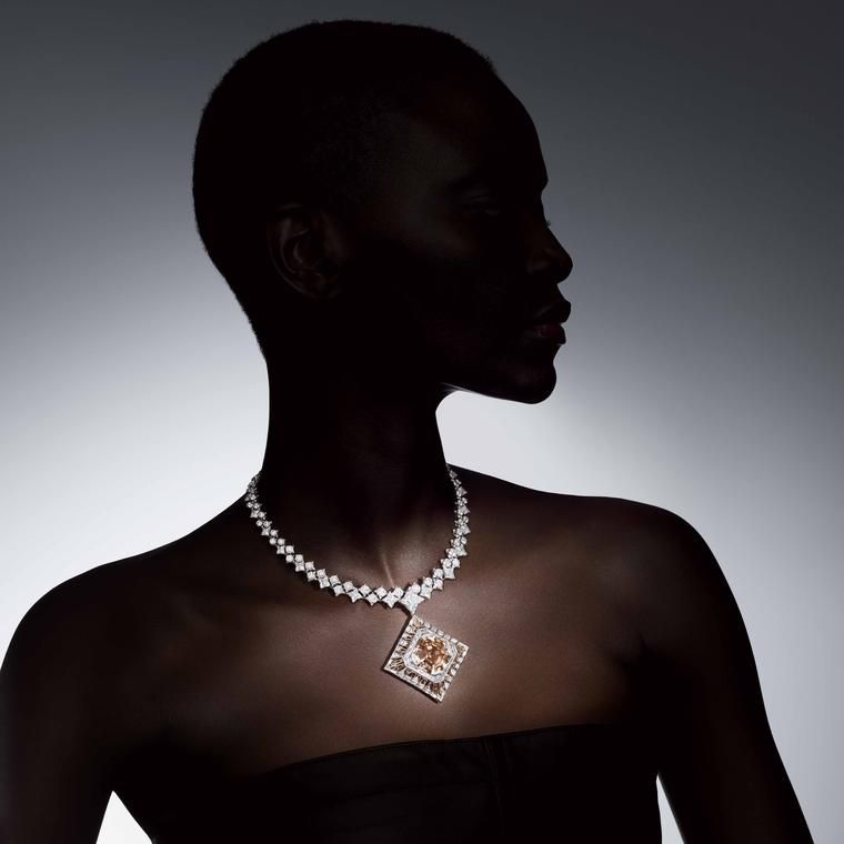 Подвеска Coeur de Paris из коллекции высокого ювелирного искусства Louis Vuitton 2024 года украшена редким 56,23-каратным оранжево-розовым бриллиантом, вдохновленным Эйфелевой башней: