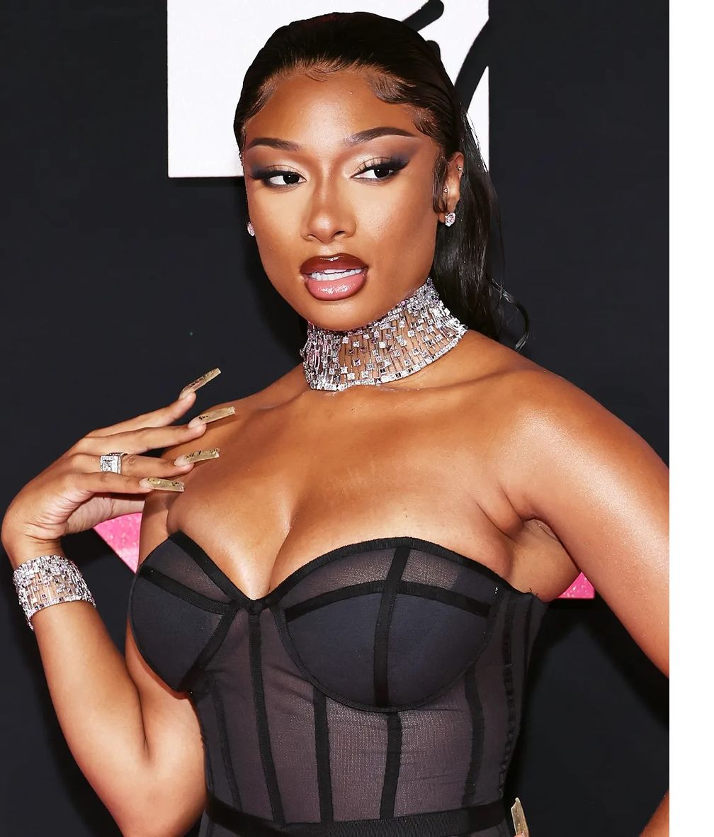 Меган ошеломляла бриллиантовым чокером Waterfall Collection от Jacob & Co. Jewelry, сверкающим великолепными бриллиантами огранки принцесса. Певица усилила гламур, дополнив его соответствующими манжетами, сверкающим кольцом и ослепительными бриллиантовыми серьгами-гвоздиками. Меган Ти Сталлион сочетала свои драгоценности с черным платьем Brandon Blackwood, стилист – Эрик Арчибальд.