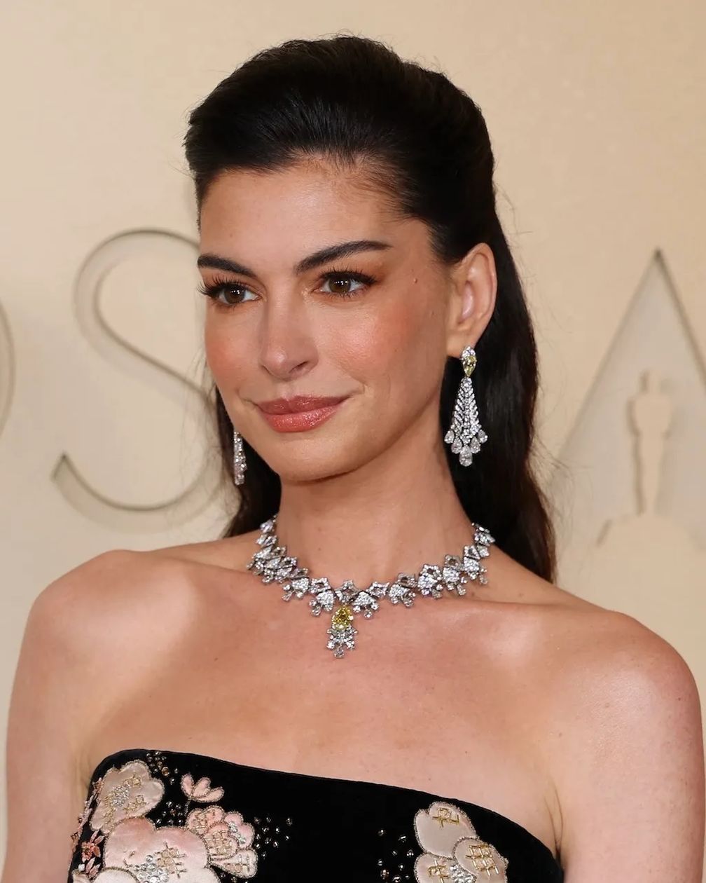 Великолепная Энн Хэтэуэй сочетала свое черное платье от Valentino Весна-лето 2026 с черными оперными перчатками в тон и потрясающими бриллиантами от Bulgari из новой коллекции элитных ювелирных украшений Eclettica. Актриса дополнила свои ослепительные бриллиантовые серьги-люстры колье из природных бриллиантов весом более 35 карат с желтым бриллиантом грушевидной формы в центре.