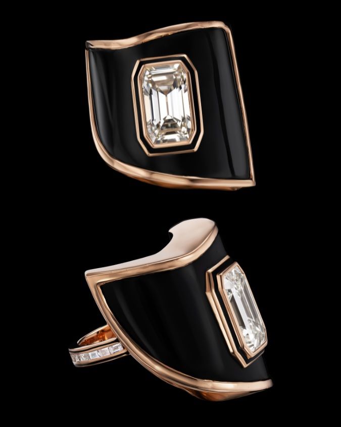 Она также выбрала пару потрясающих колец с бриллиантами и ониксом от Deszo by Sara Beltrán.