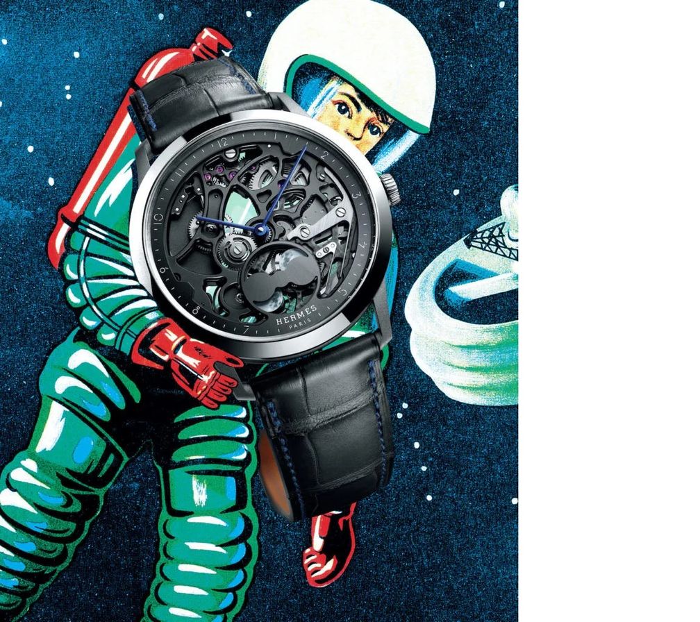 Часы Slim d’Hermès Squelette Lune – это игра парадоксов с элементами классики и современности, сдержанности и уверенности. Умелое сочетание материалов – титановый корпус дополнен безелем из драгоценной платины и заводной головкой из белого золота –создает тонкий световой и текстурный эффект.