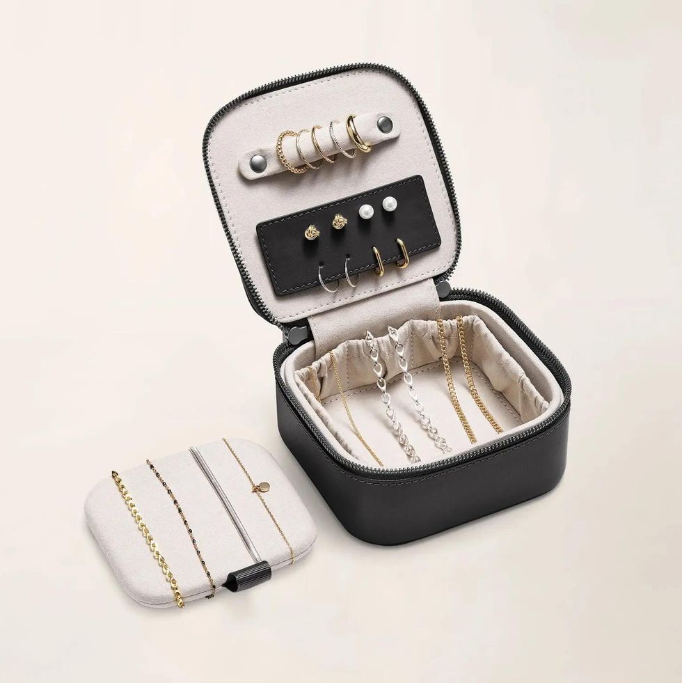 В футляре Away все продумано до мелочей: съемная панель для тонких браслетов и эластичный лоток, который не даст цепочкам запутаться при транспортировке.