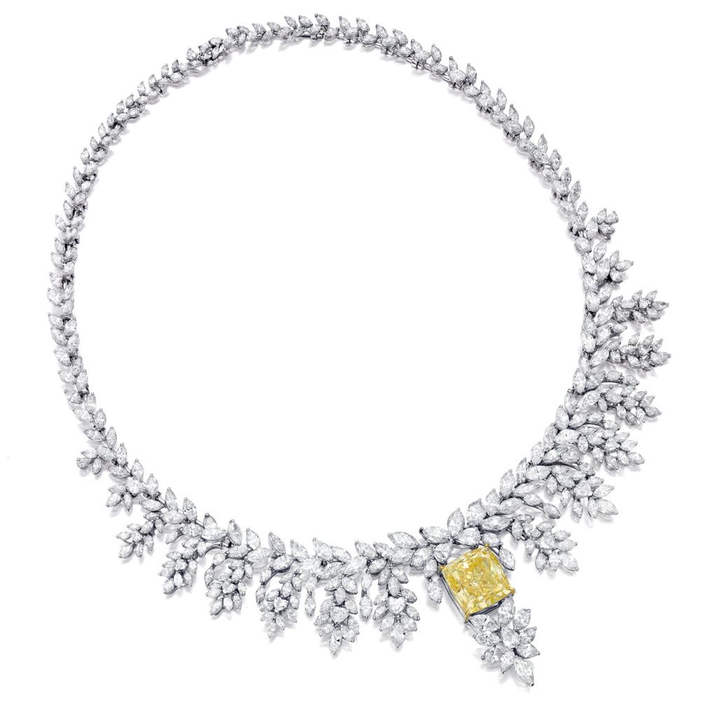 Колье с бриллиантом весом 17,04 карата, фантазийного интенсивно-желтого цвета, безупречным внутри, окруженным бриллиантами огранки груша, сердце и маркиз общим весом около 62,75 карата, было продано за $ 318 000, что чуть ниже его предпродажной максимальной оценки.