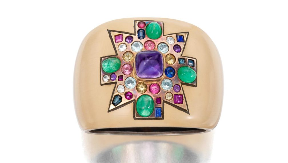 Этот браслет, созданный около 1930 года Verdura for Chanel, украшен аквамаринами, изумрудами, аметистами, сапфирами и рубинами в форме мальтийского креста. Он принес $ 432 300, превысив максимальную оценку в $ 225 000.
