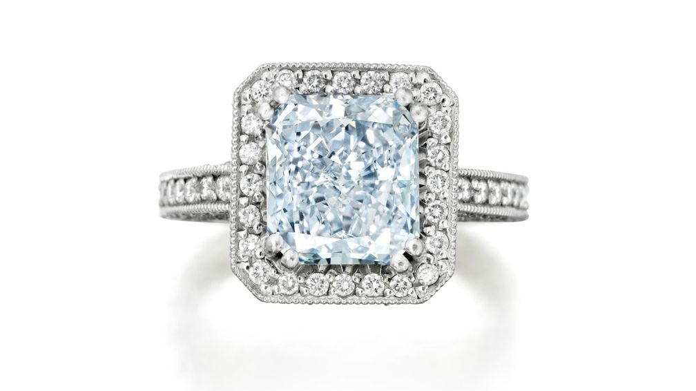 Кольцо с фантазийным светло-голубым бриллиантом огранки кушон, весом 3,01 карата, чистоты VS1 стоило на нью-йоркских торгах $ 279 900, не превысив предварительные оценки.