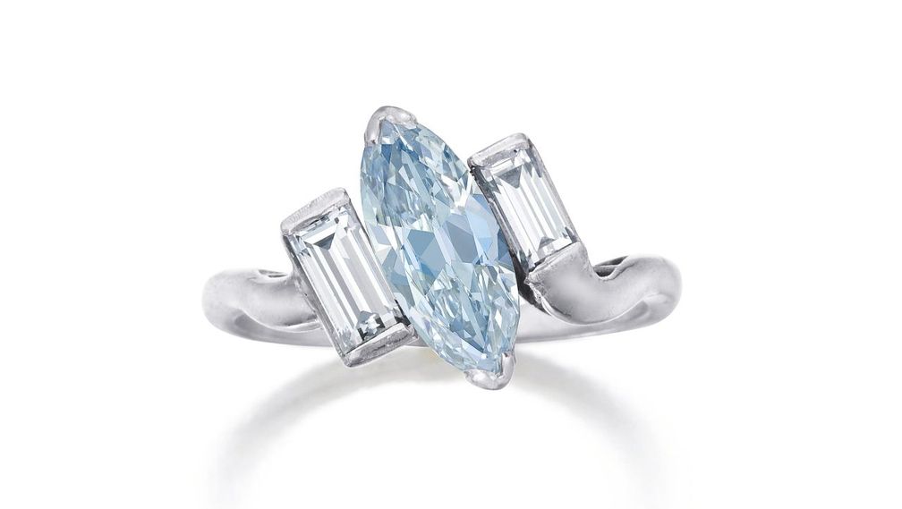 Кольцо с фантазийным интенсивно-голубым бриллиантом овальной формы, весом 1,22 карата, фланкированным с одной стороны фантазийным голубым бриллиантом весом 0,35 карата, а с другой – фантазийным интенсивно-голубым бриллиантом весом 0,53 карата, стоило $ 381 500, в пределах оценок.