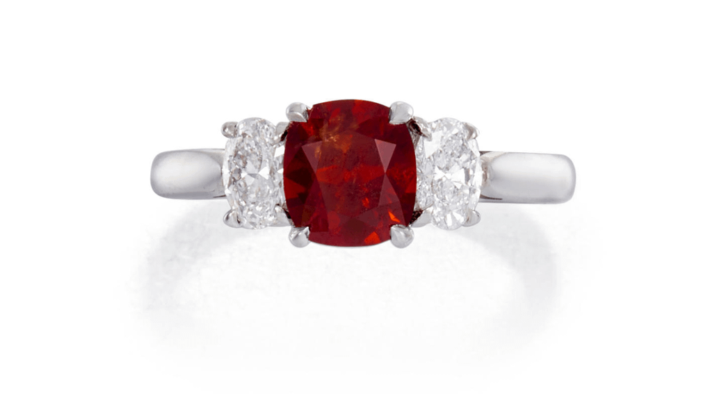 Кольцо с центральным бриллиантом фантазийного коричнево-красного цвета, огранки кушон, весом 1,30 карата, фланкированным бриллиантами овальной формы, было продано за $ 254 500, в пределах оценок.