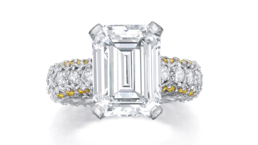 Кольцо Tacori с центральным камнем огранки изумруд, весом 6,59 карата, цвета F, чистоты VVS2, акцентированным белыми и желтыми круглыми бриллиантами, было продано за $ 203 700, превысив максимальную оценку в $ 180 000.