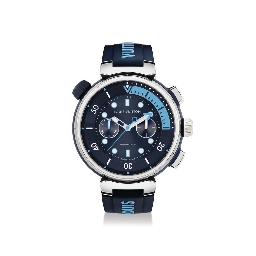 Louis Vuitton представляет новейшую модель с автоподзаводом из коллекции Tambour диаметром 46 мм, водонепроницаемую до 100 метров и оснащенную новой функцией хронографа, выполненную в том же смелом стиле Blue Skyline с двумя оттенками, что и спортивная модель Tambour, удостоенная награды GPHG 2021 года.