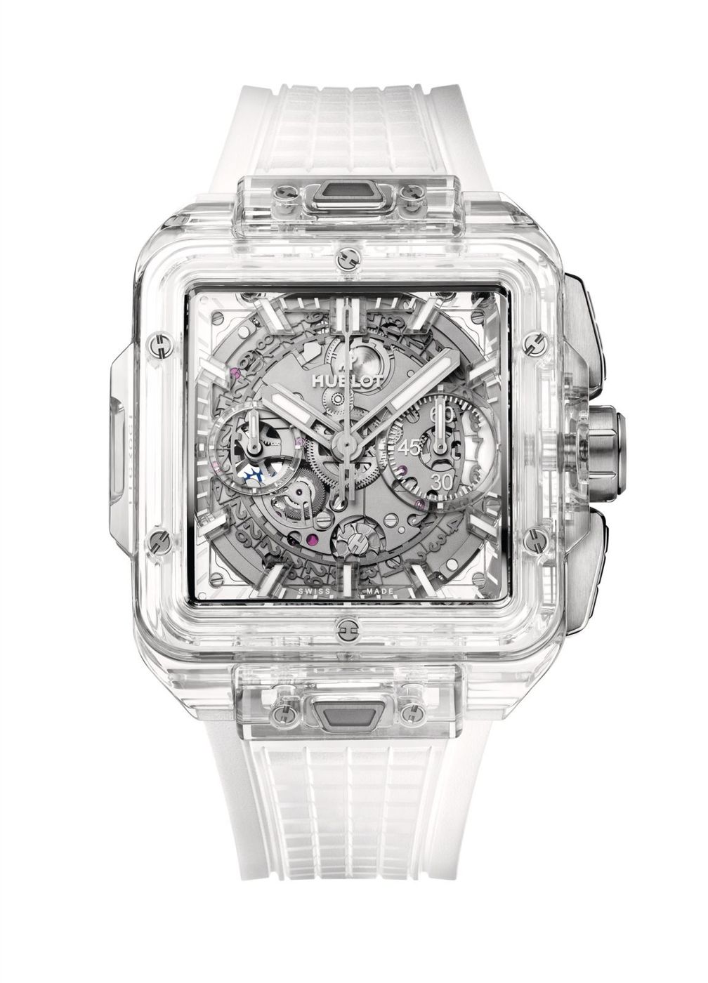Компания Hublot демонстрирует свой технический опыт, решив двойную задачу – разработать квадратный формат и многослойный сапфировый корпус, и выпустив ограниченную серию из 250 экземпляров хронографа с функцией flyback с автоподзаводом на колонном колесе, водонепроницаемым до глубины 5 АТМ, с 72-часовым запасом хода.