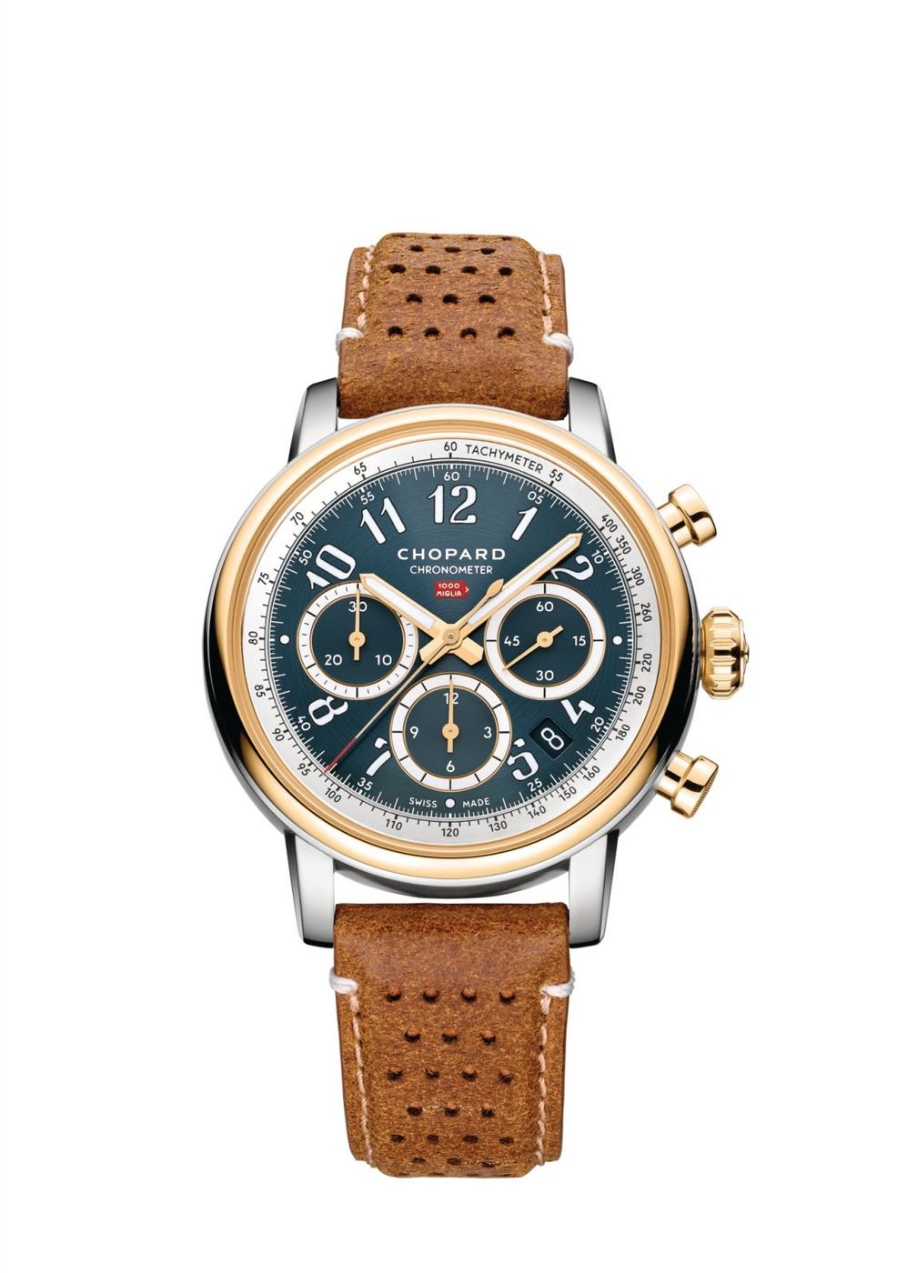 Приветствуя новейший дизайн своей знаменитой коллекции, Chopard – официальный хронометрист гоночных соревнований Mille Miglia – использует уменьшенный 40,5-миллиметровый корпус из стали Lucent Steel, темно-синий оттенок которого и отделка розовым золотом наполнены адреналином.