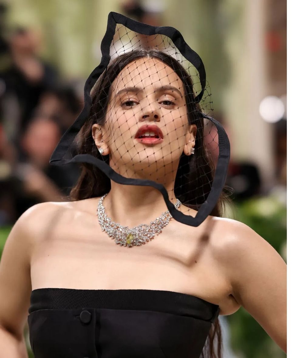 На Met Gala 2024 года Розалия надела невероятное колье с белыми бриллиантами в дополнение к гигантскому канареечному бриллианту в центре.