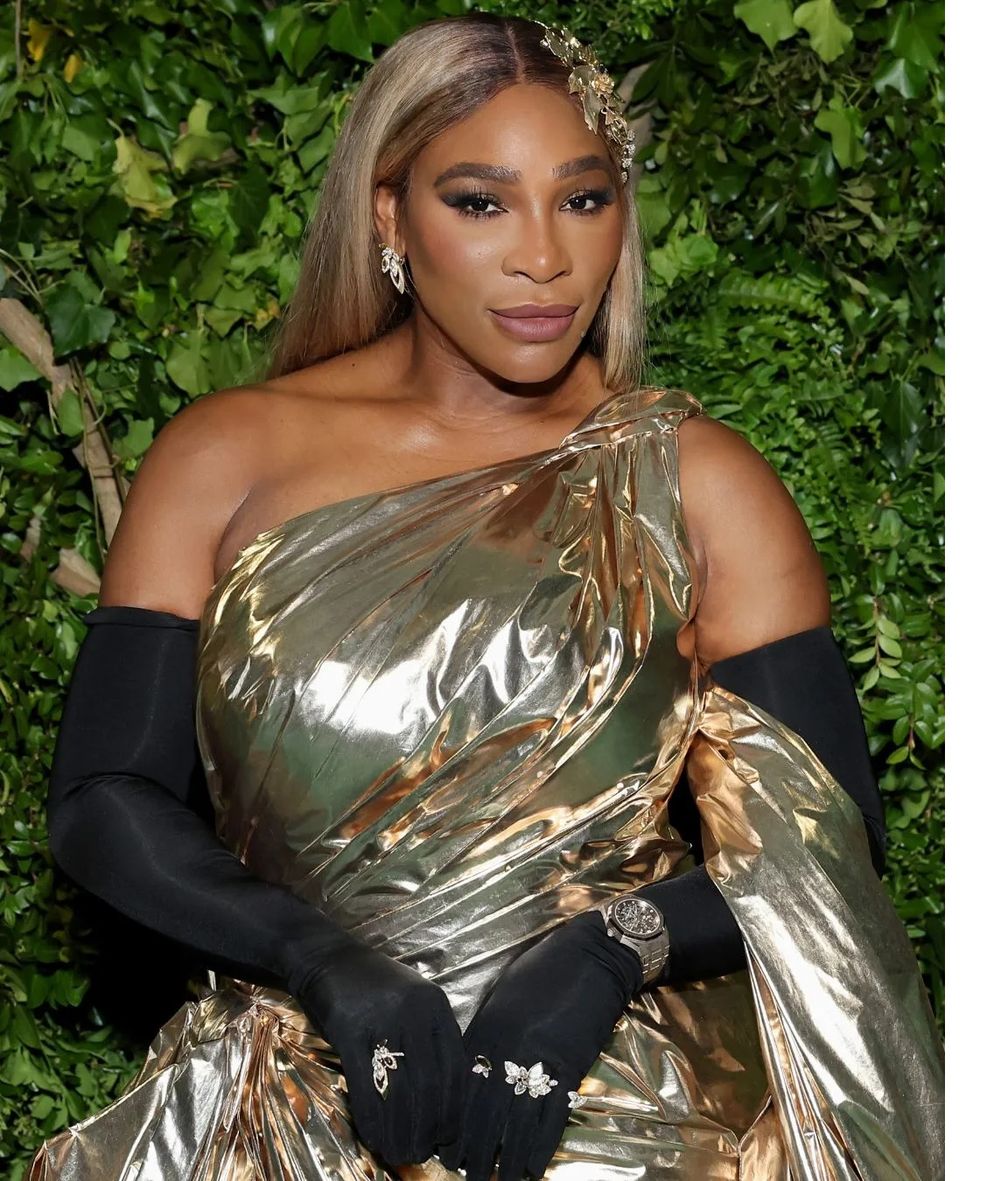 Серена Уильямс была одета в сверкающее золотое платье от Balenciaga, дополненное коллекцией колец с бриллиантами от Messika и часами Audemars Piaget.