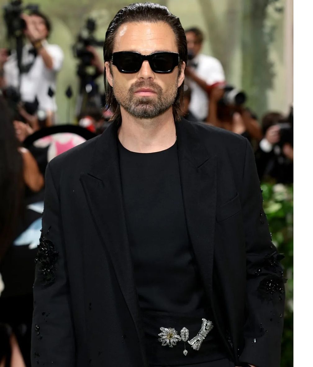Себастиан Стэн выглядел привлекательно в полностью черном ансамбле, дополненном тремя винтажными брошами от Cartier, которые он носил на поясе.