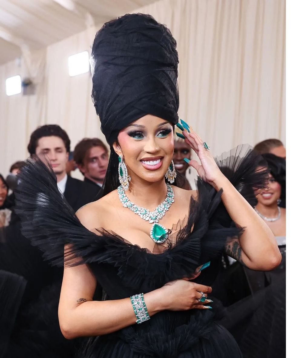Cardi B надела сногсшибательный сет из природных бриллиантов и изумрудов в сочетании с потрясающим платьем, которое было настолько объемным, что покрывало всю ковровую дорожку.