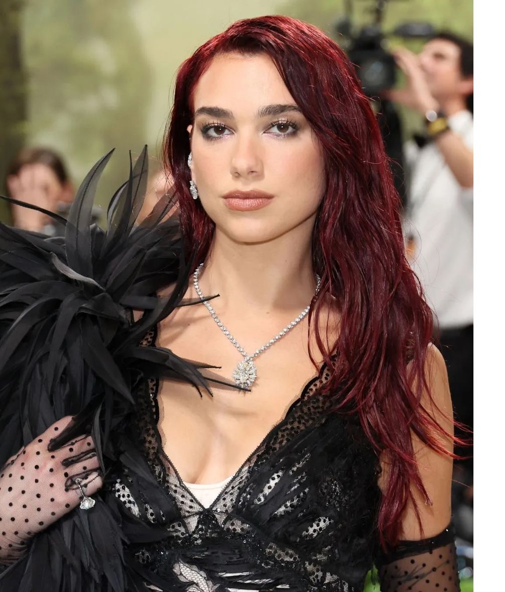 Последний альбом Дуа Липы, Radical Optimism, вышел за несколько дней до Met Gala, поэтому она выглядела сияющей. Певица прибыла вместе с Марком Джейкобсом в платье, созданном дизайнером на заказ. Она дополнила свой образ украшениями Tiffany & Co. с бриллиантами, включая кольцо на мизинце, серьги-кластеры и колье с бриллиантовой звездой.