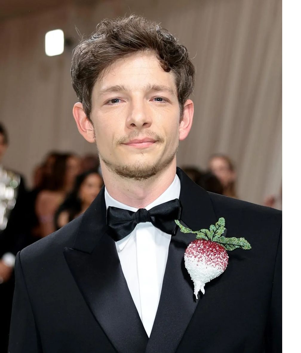 Майк Файст надел потрясающую брошь с бриллиантами в виде свеклы от JAR. Он готов к работе в саду и идеально подходит для тематического показа Met Gala 2024 года.