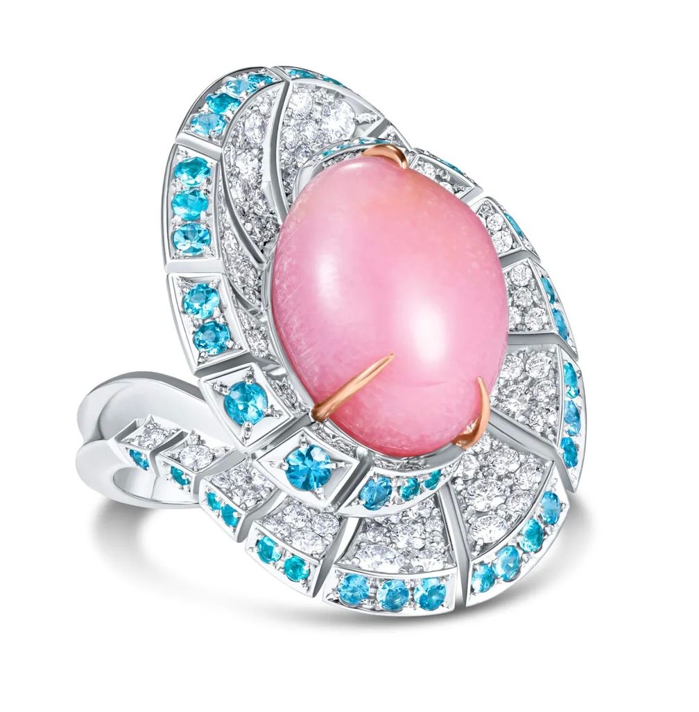 Это кольцо от David Morris украшено редкой розовой жемчужиной конк весом более 17 карат, добытой в Карибском море. Она расположена в центре вихря из бриллиантов и турмалинов параиба.