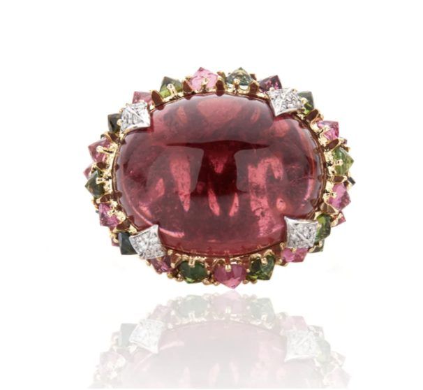 В украшениях Faraone Mennella четко прослеживается связь между прошлым и будущим: от культовых сережек Stella до новых смелых дизайнерских решений, таких как это потрясающее кольцо с кабошоном из рубеллита, хризолитов и розовых турмалинов.