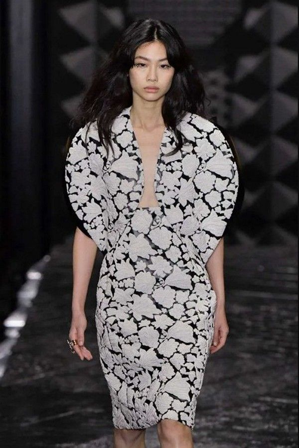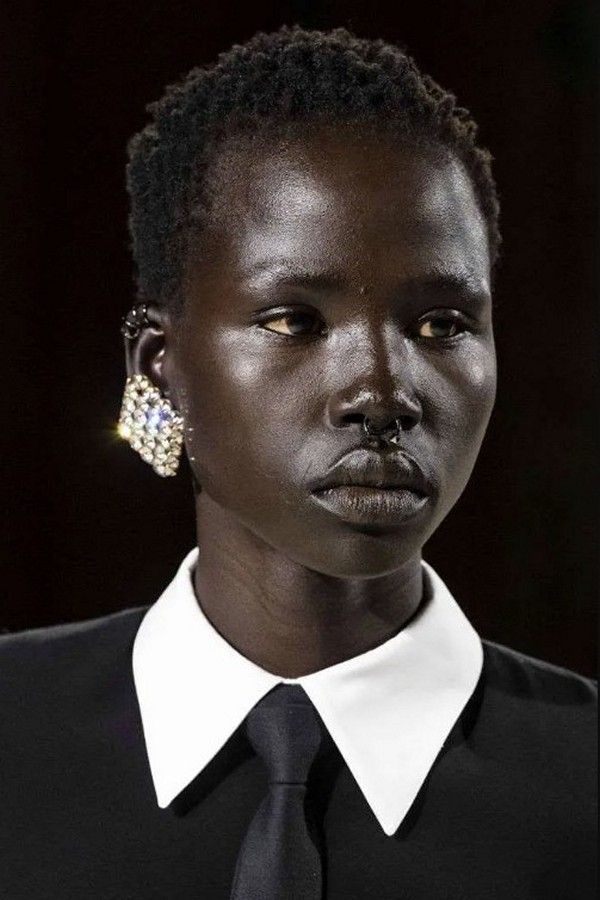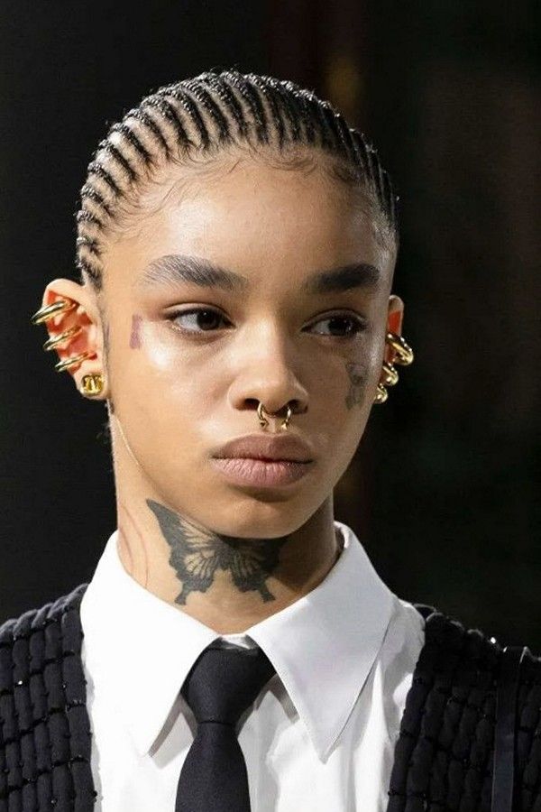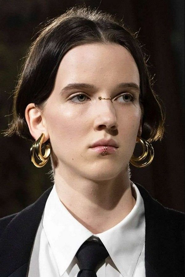 У Valentino всего было много. Серьги-обручи были массивными, кристаллы огромными, и каждое место для золотого кольца на лице модели было украшено. Кольца для губ, каффы для ушей, кольца в носу. Пирсинг украшал даже пространство между глазами модели.