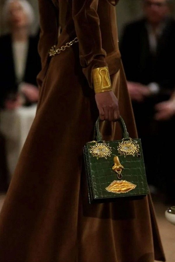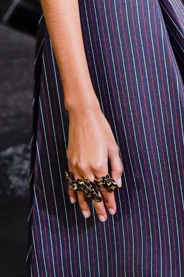 Руки моделей определенно проделали всю «тяжелую работу», когда дело дошло до украшений в Louis Vuitton. Большие золотые кольца на каждом пальце, украшенные цветочным символом бренда, придавали образам панковскую нотку, а также привлекали внимание ко всем новым желанным сумочкам, которые появились на подиуме.
