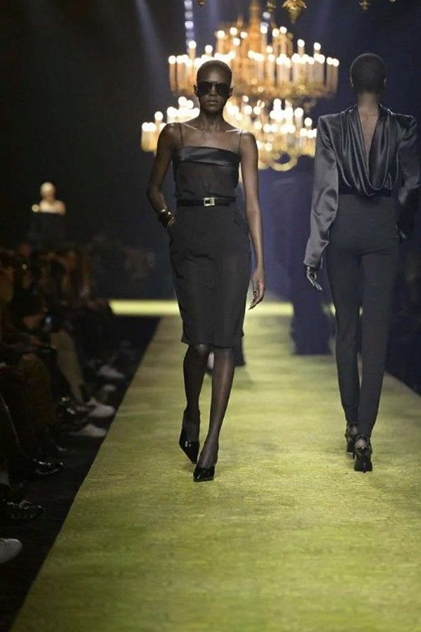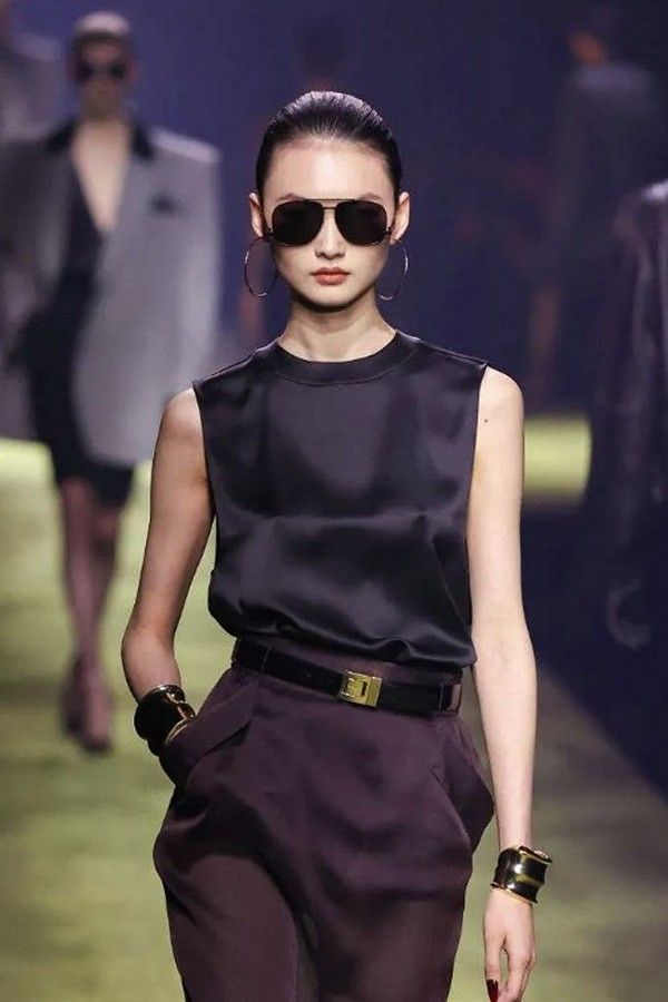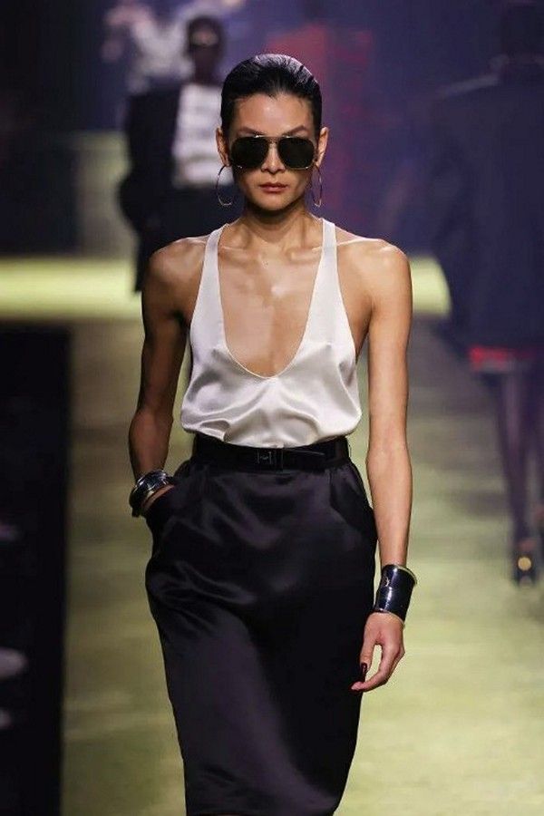 Широкие манжеты, которые носили поодиночке или парами, придавали особую жесткость атласным тканям на показе Saint Laurent. В сочетании с обручами XL и солнцезащитными очками «авиатор» весь образ, безусловно, создавал атмосферу фильма «Топ Ган: Мэверик».